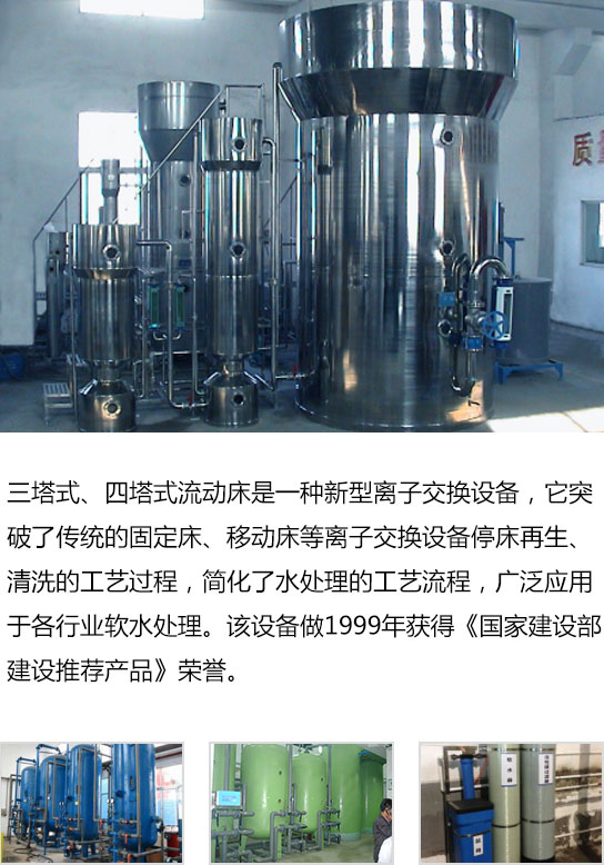 三塔式、四塔式流動床是一種新型離子交換設(shè)備,它突破了傳統(tǒng)的固定床、移動床等離子交換設(shè)備停床再生、清洗的工藝過程,簡化了水處理的工藝流程,廣泛應(yīng)用于各行業(yè)軟水處理。該設(shè)備做1999年獲得《國家建設(shè)部建設(shè)推薦產(chǎn)品》榮譽(yù)。
