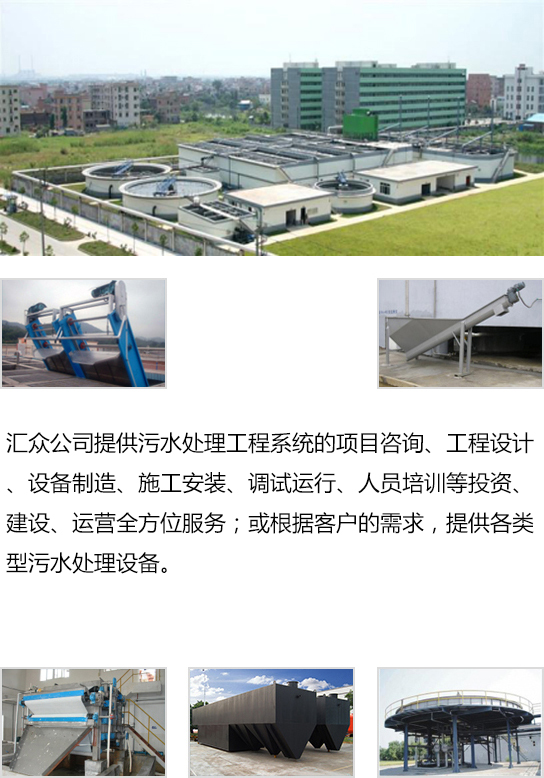 匯眾公司提供污水處理工程系統(tǒng)的項(xiàng)目咨詢、工程設(shè)計(jì)、設(shè)備制造、施工安裝、調(diào)試運(yùn)行、人員培訓(xùn)等投資、建設(shè)、運(yùn)營全方位服務(wù);或根據(jù)客戶的需求,提供各類型污水處理設(shè)備。