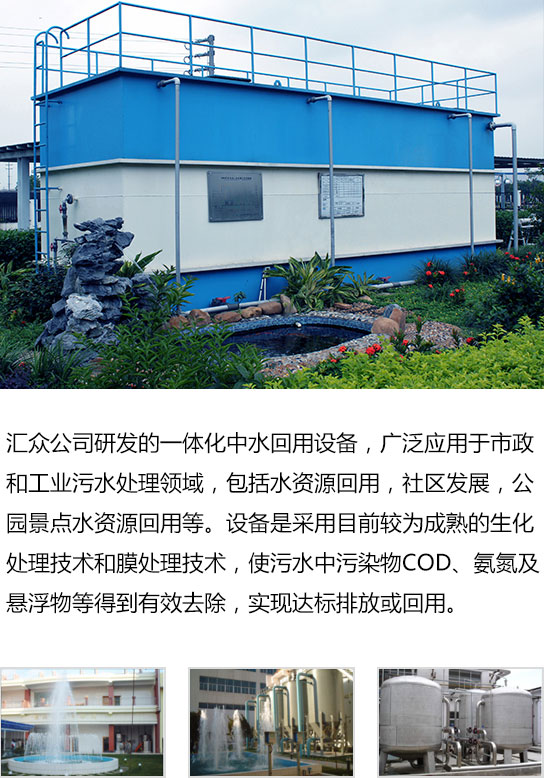 匯眾公司研發(fā)的一體化中水回用設(shè)備,廣泛應(yīng)用于市政和工業(yè)污水處理領(lǐng)域,包括水資源回用,社區(qū)發(fā)展,公園景點(diǎn)水資源回用等。設(shè)備是采用目前較為成熟的生化處理技術(shù)和膜處理技術(shù),使污水中污染物COD、氨氮及懸浮物等得到有效去除,實(shí)現(xiàn)達(dá)標(biāo)排放或回用。